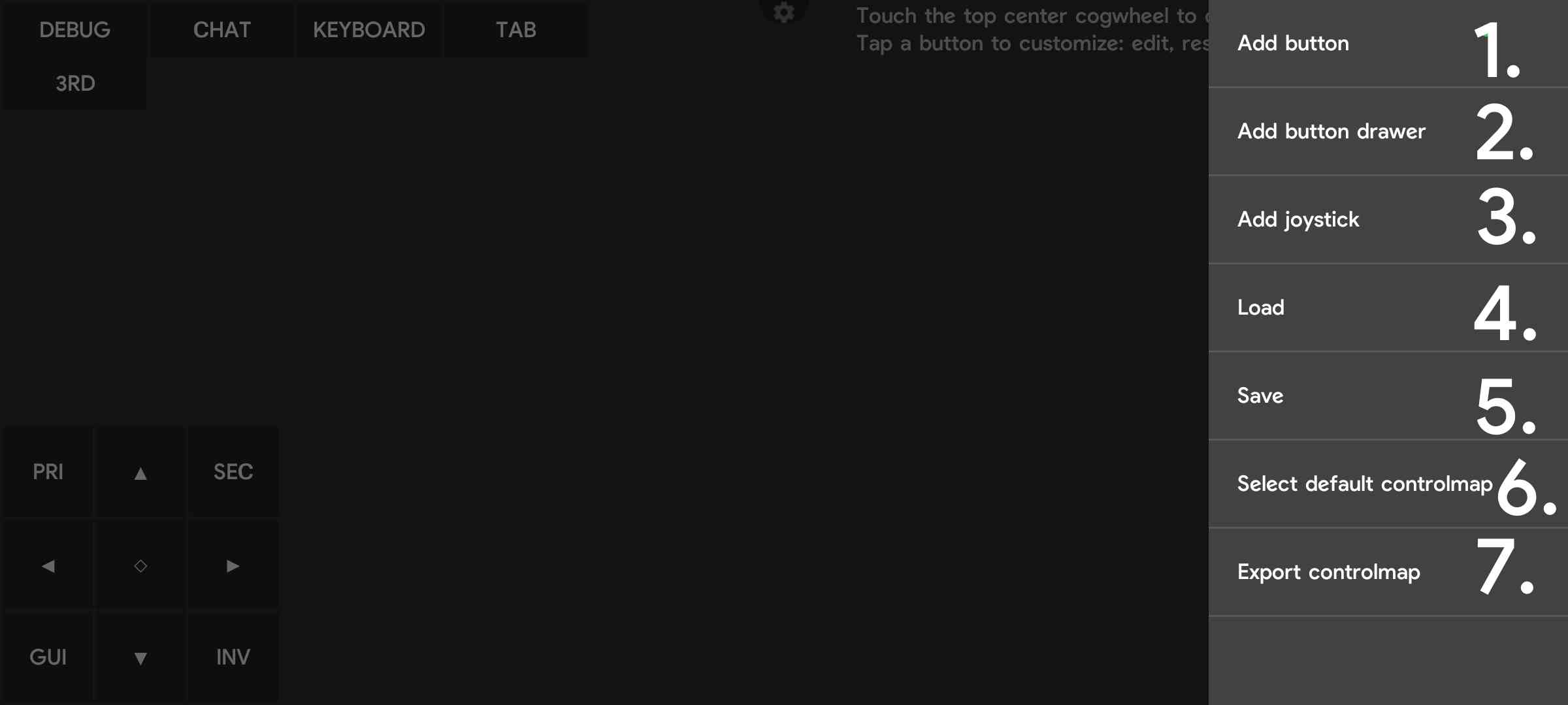 6- Adds a button drawer, has a function of adding a sub-button binded to its drawer. When pressed, buttons binded to it will show up, configurable to make it hold button instead of toggling.